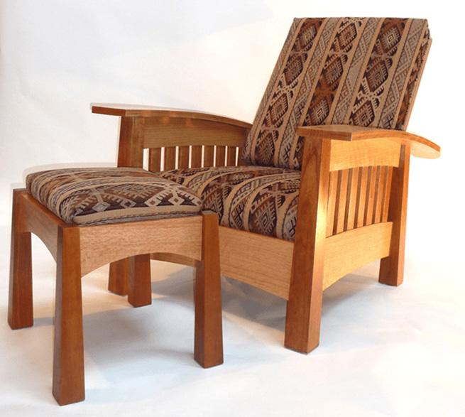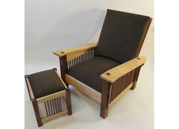 This chair and footstool has been changed with curly maple and Clario walnut. The back has five adjustments. The Upholstery is Ultra Suede. This chair features quadralinear leg construction. The legs have four Special Sawn Walnut boards mitered and then glued. This construction technique best displays the walnut grain pattern, which seems to wrap around the leg. The arms are stunning with curly maple which is highly figured.